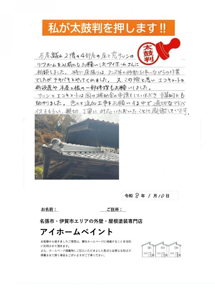 ホーム > お客様から頂いた評判の声 > 伊賀市で屋根工事をして頂きましたO様より